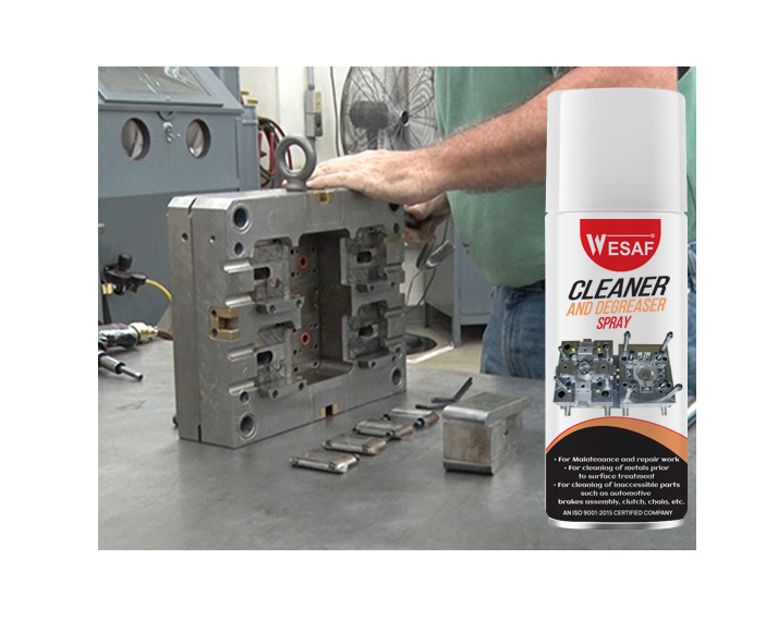 DESCRIPTION : The powerful cleaning formula of Wesaf Mold Cleaner removes contaminants down to the virgin metal. Its quickly-evaporating chemistry pulls residue, oils, dirt, and grit from the pores of the metal and eliminates bleeding these contaminants into hard-to-reach areas of the mold like ejector pins and other moving parts.