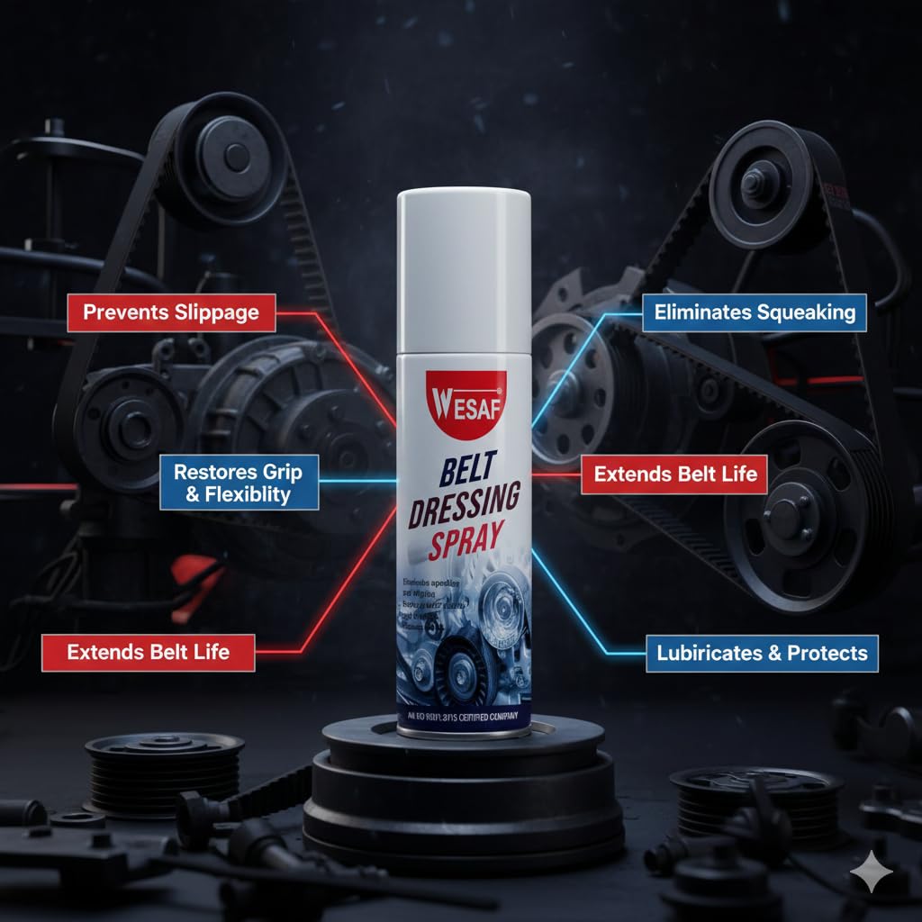 Wesaf's Belt Dressing Spray is an essential product for optimizing belt drives. This aerosol spray eliminates squeaking and slipping, restoring belts' pliability and extending their life. Its tacky polymeric formulation provides lubrication to the contacting surfaces of the belt and pulley, reducing strain on bushings and bearings. It optimizes belt tension, reducing the need for frequent tightening. The spray conditions V-belts and fan belts, preventing premature wearing and keeping them flexible and soft to enable repeated bending. With an ISO 9001:2015 certification, this spray ensures optimal output from your belt drive system.