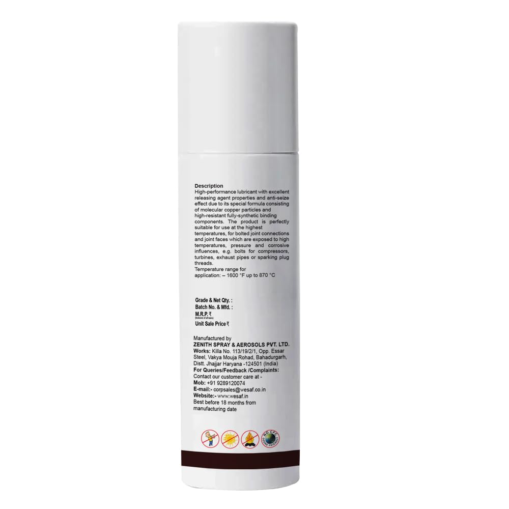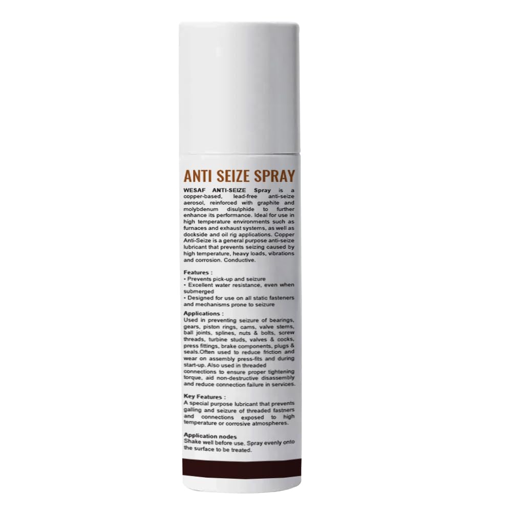 Anti-seize Spray is a specialised lubricant that protects metal parts from corrosion and seizure up to (1000 C). This industrial-grade aerosol is formulated with solid lubricants and other substances that lower friction and reduce torque wrench in threaded fasteners and fittings. Its convenient spray application ensures thorough coverage, making it an indispensable tool for maintenance and repair tasks across various industries. With its exceptional lubrication properties and high-temperature resistance, Anti-seize Spray ensures smooth operation and extended service life of critical components. Certified by an ISO 9001:2015 company, this product delivers reliable performance for industrial use.