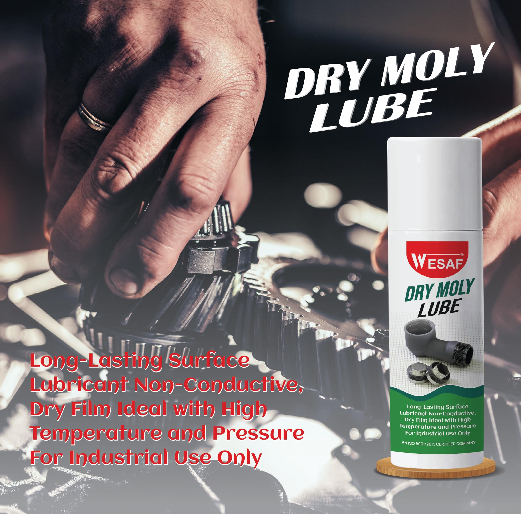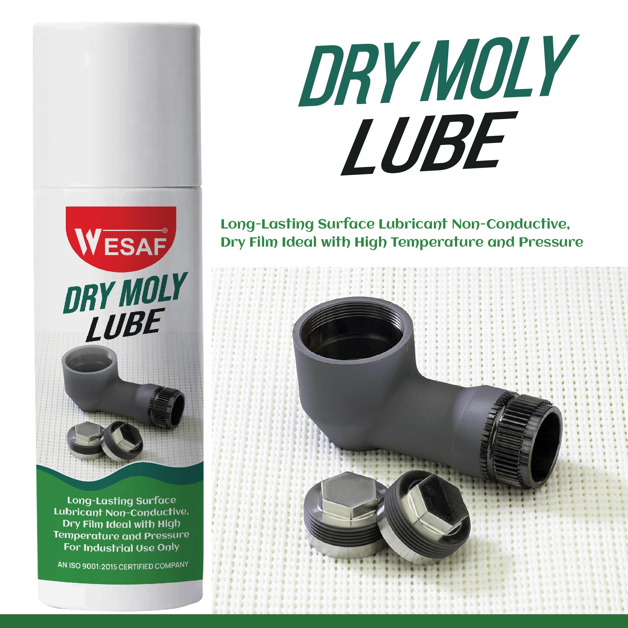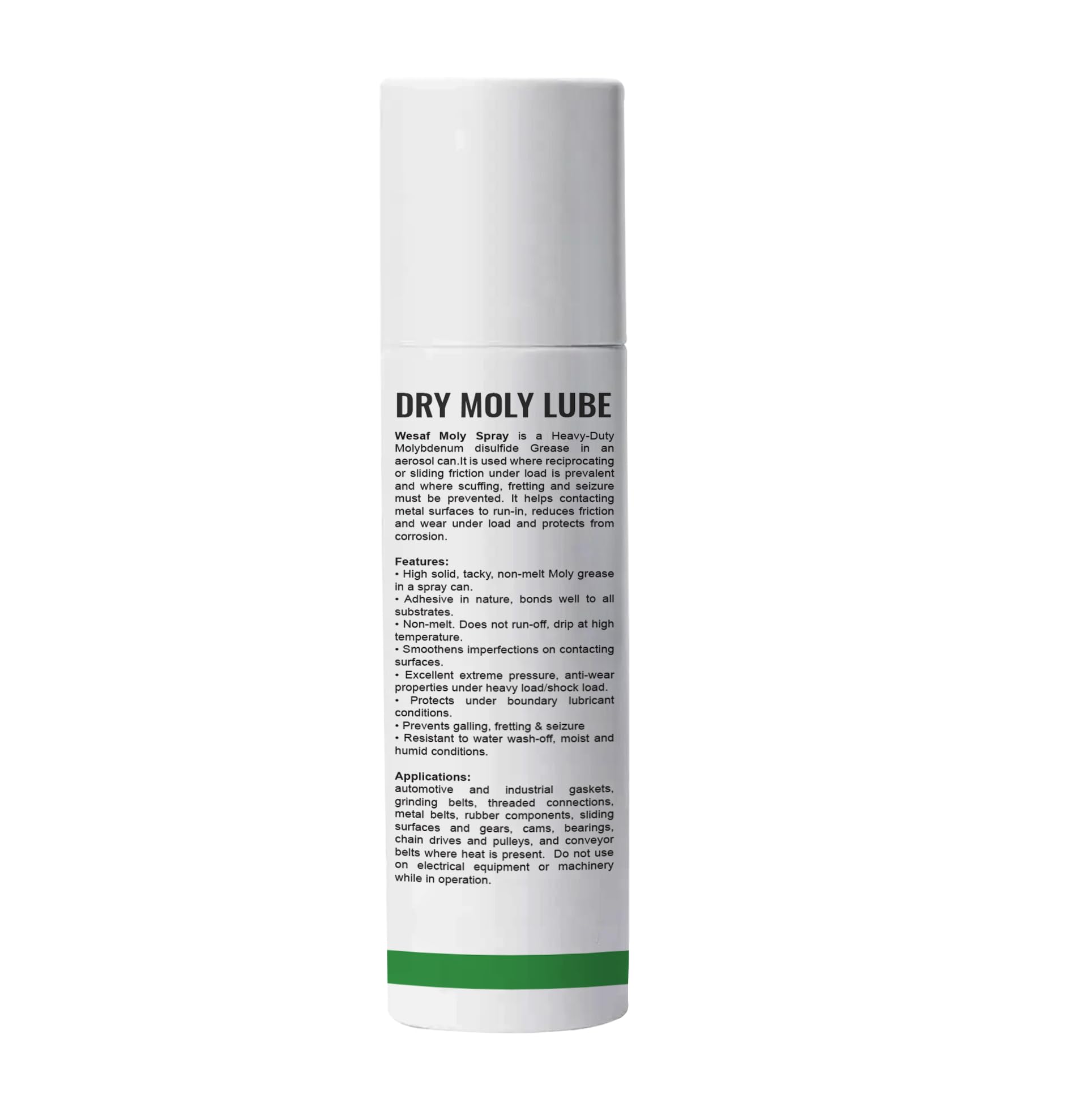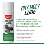 Wesaf’s Dry Moly Lube is a long-lasting, non-conductive surface lubricant that comes in a convenient spray can. This high-solid, tacky, non-melt moly grease forms a dry film that excels under high temperature and pressure conditions. It adheres well to all substrates without running off or dripping, smoothening imperfections on contacting surfaces. With excellent extreme pressure and anti-wear properties, it protects under boundary lubricant conditions, preventing galling, fretting, and seizure. Resistant to water wash-off, moisture, and humidity, this versatile lubricant is ideal for industrial use. It bonds firmly to the substrate, facilitating easier running-in and reducing friction and wear under load while protecting against corrosion.