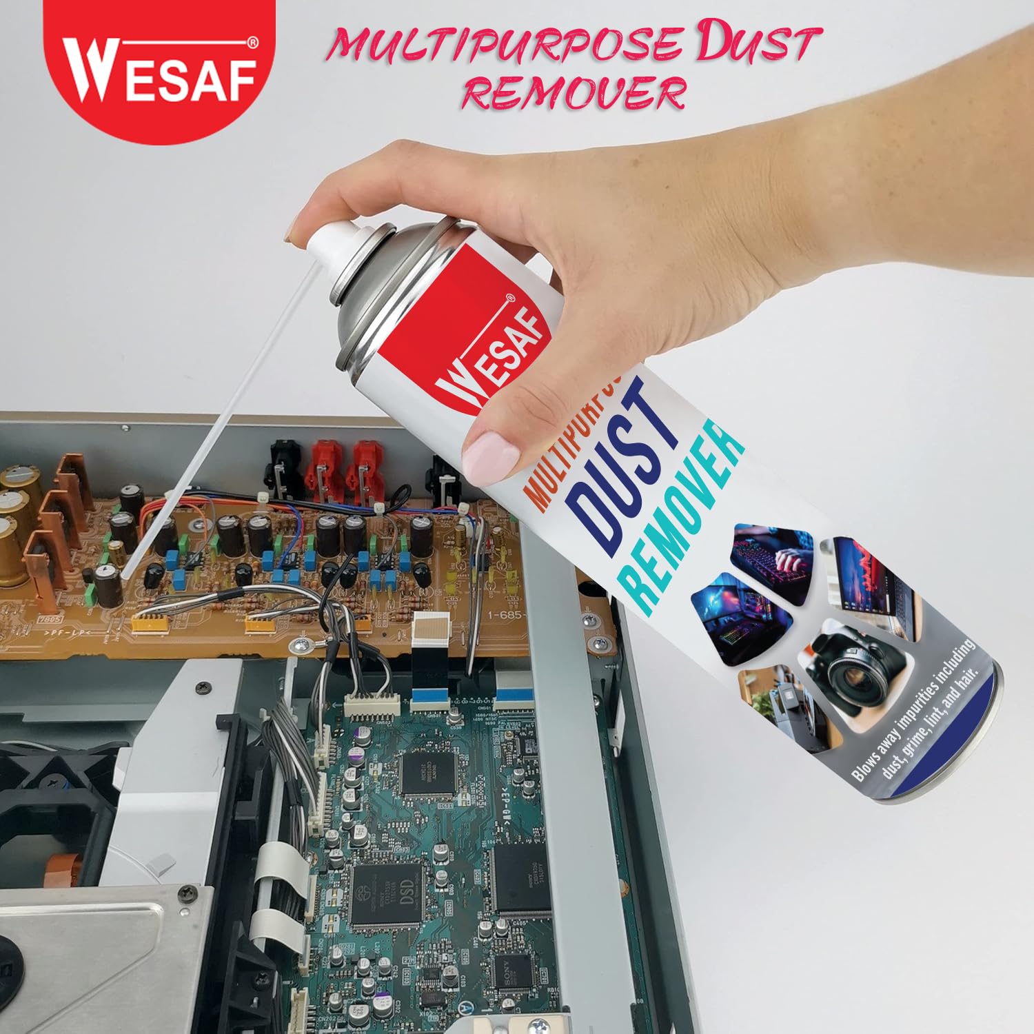 WESAF Multipurpose Dust Remover is your ultimate solution for keeping electronic devices and equipment pristine. This powerful 450ml air duster effectively blows away dust, grime, lint, and hair from a wide range of devices including air conditioners, mobile phones, laptops, PCs, televisions, cameras, keyboards, stereo systems, and servers. The high-pressure spray delivers a concentrated burst of clean, residue-free air that reaches deep into crevices and delicate areas where regular cleaning methods can't access. Perfect for both home and professional use, this non-corrosive formula ensures safe cleaning of sensitive electronic components and precision equipment. The versatile spray can helps maintain optimal performance of your devices by preventing dust build-up and potential overheating issues. Keep your valuable electronics running smoothly with regular maintenance using this efficient dust removal solution.